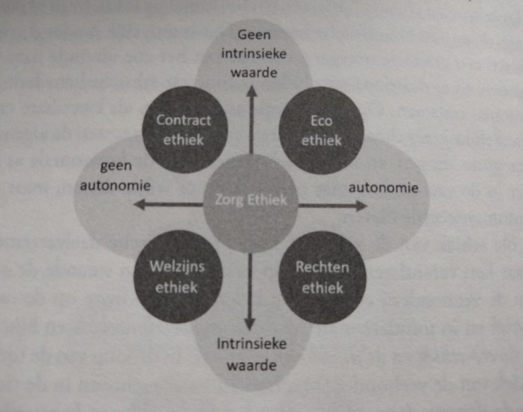 De vier bestaande ethische benaderingen, met een centrale plaats voor de zorgethiek. De mate waarin intrinsieke waarde en autonomie worden toegekend aan dieren is bepalend voor de ethische beginselen die men kan hanteren. De beginselen van de zorgethiek blijven in alle gevallen van toepassing.